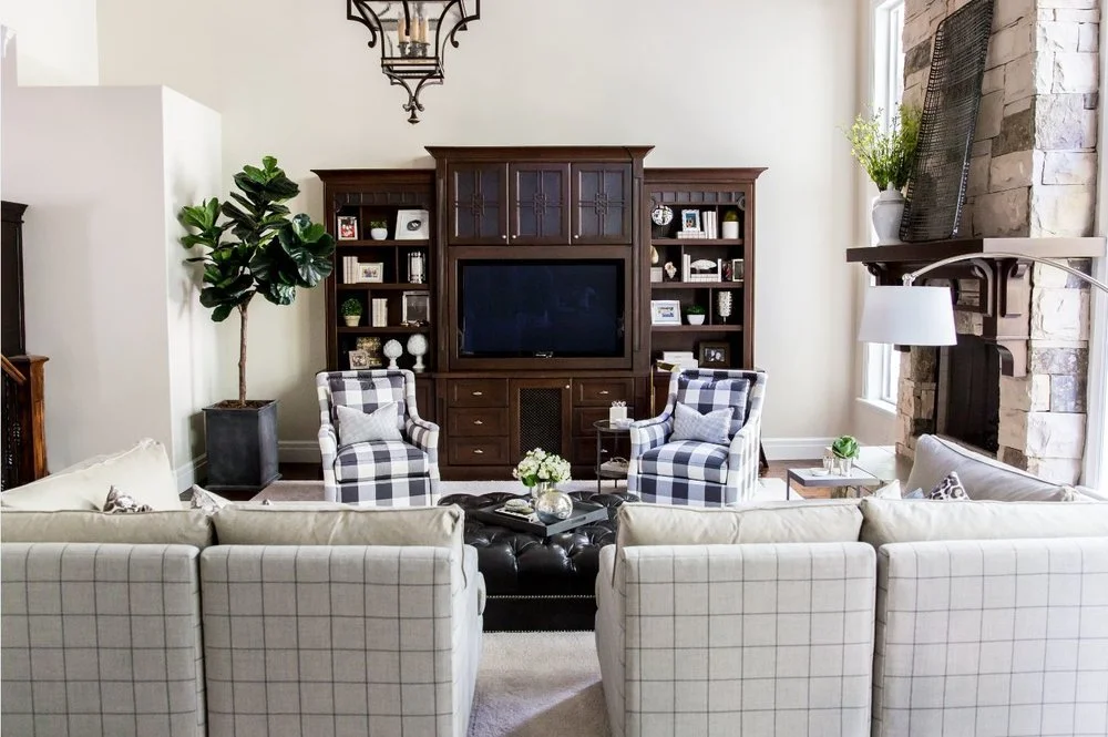 This big family room on the main floor is so inviting. The custom furniture turned out gorgeous and the entire flow of the room just feels right. And, we love it when we can add a fiddle leaf fig tree to any space!