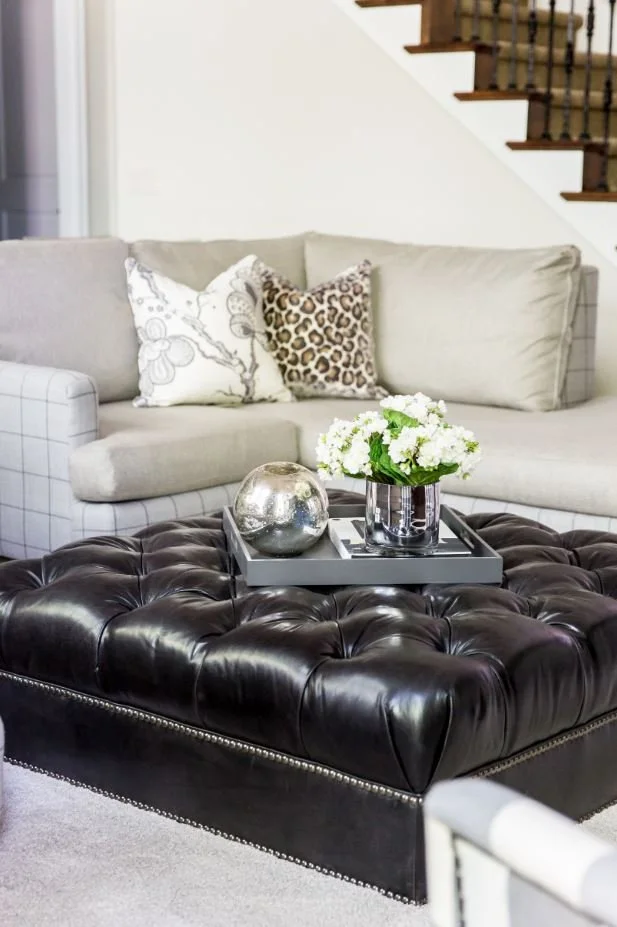 Another great functional piece is a beautiful ottoman like this one! It doubles as a coffee table and provides the perfect place to rest your feet. Checkout the nailhead detail—we think they are perfect!